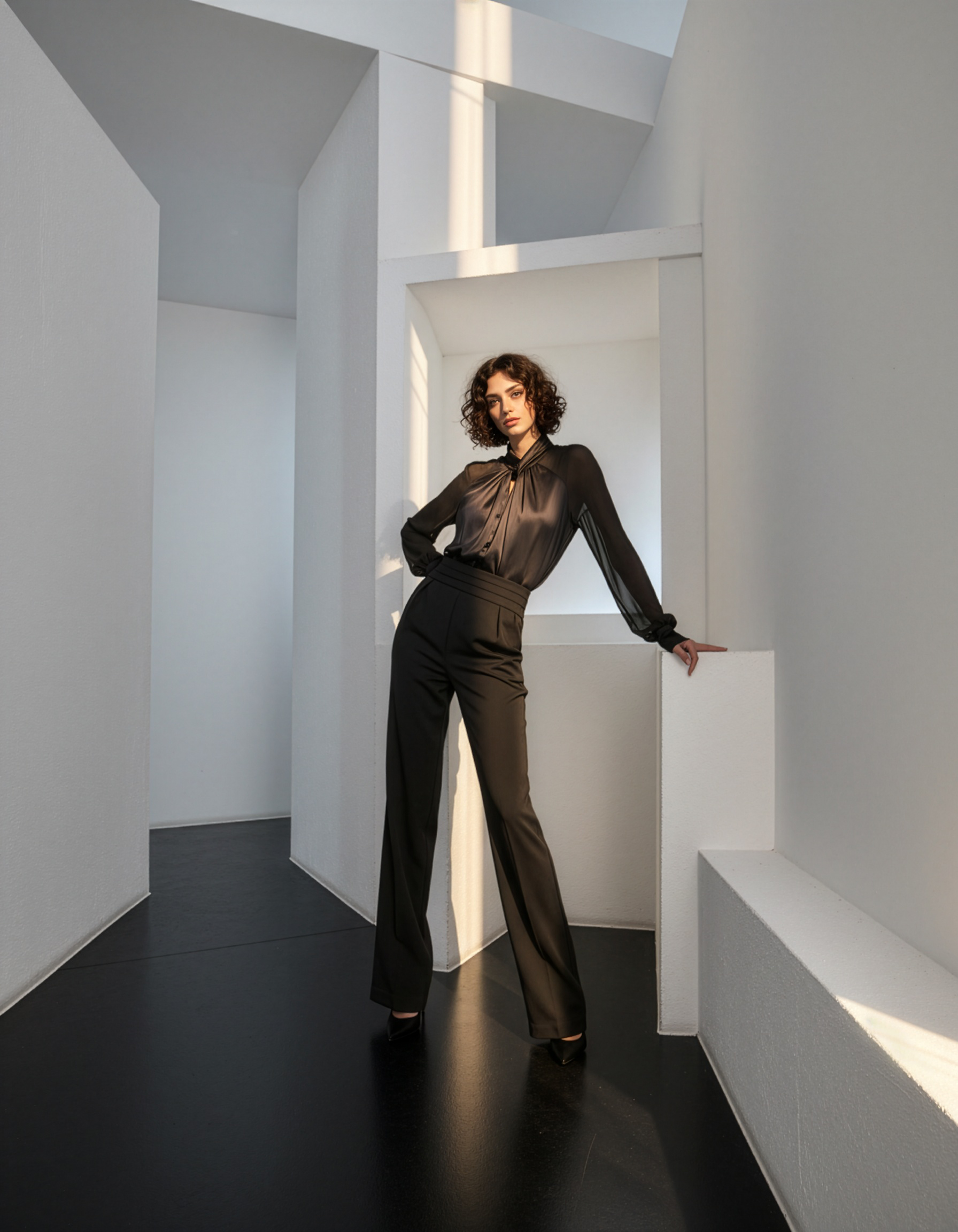 Elevate your eveningwear with this timeless black satin top. Its sheer sleeves adds a modern touch to any classic look. Indulge in the luxurious fabric and create a sophisticated, exclusive look.