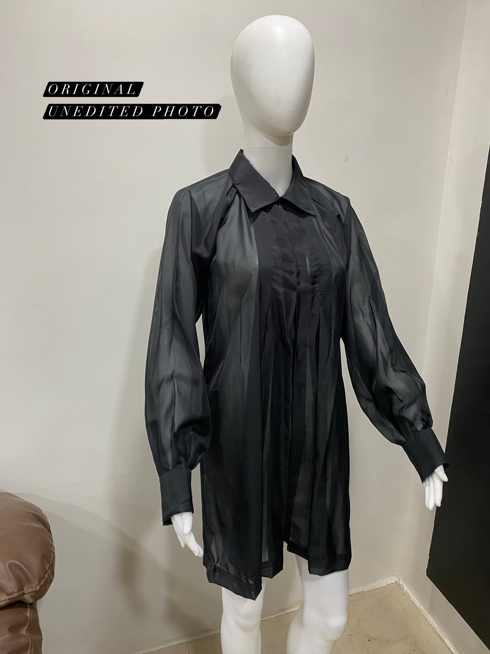 Elevate your wardrobe with this Black Sheer Shirt Dress, featuring an elegant pleated front panel that adds refined texture and dimension. The delicately sheer fabric offers a subtle allure, while the puff sleeves bring a touch of vintage-inspired sophistication. Perfect for both day and evening wear, this dress balances modern design with classic grace for a truly polished look.