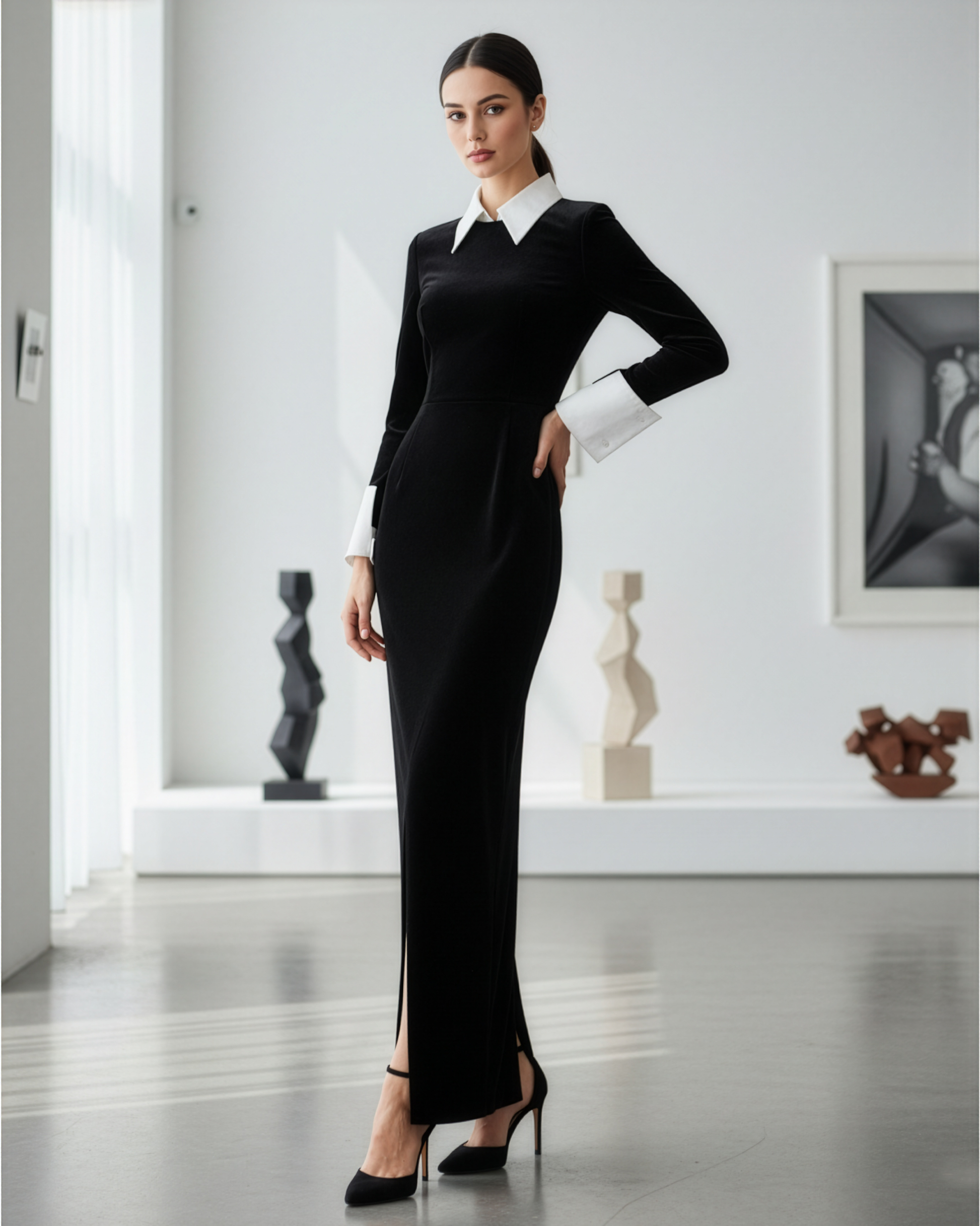 Unleash the power of contrast with our Black White Collar Cudd Gown. This sophisticated gown features a striking white collar accent that adds a touch of elegance and refinement. Inspired by the classic formal shirt, this gown exudes luxury and style. Show off your legs with the thigh slit for a glamorous and daring look.