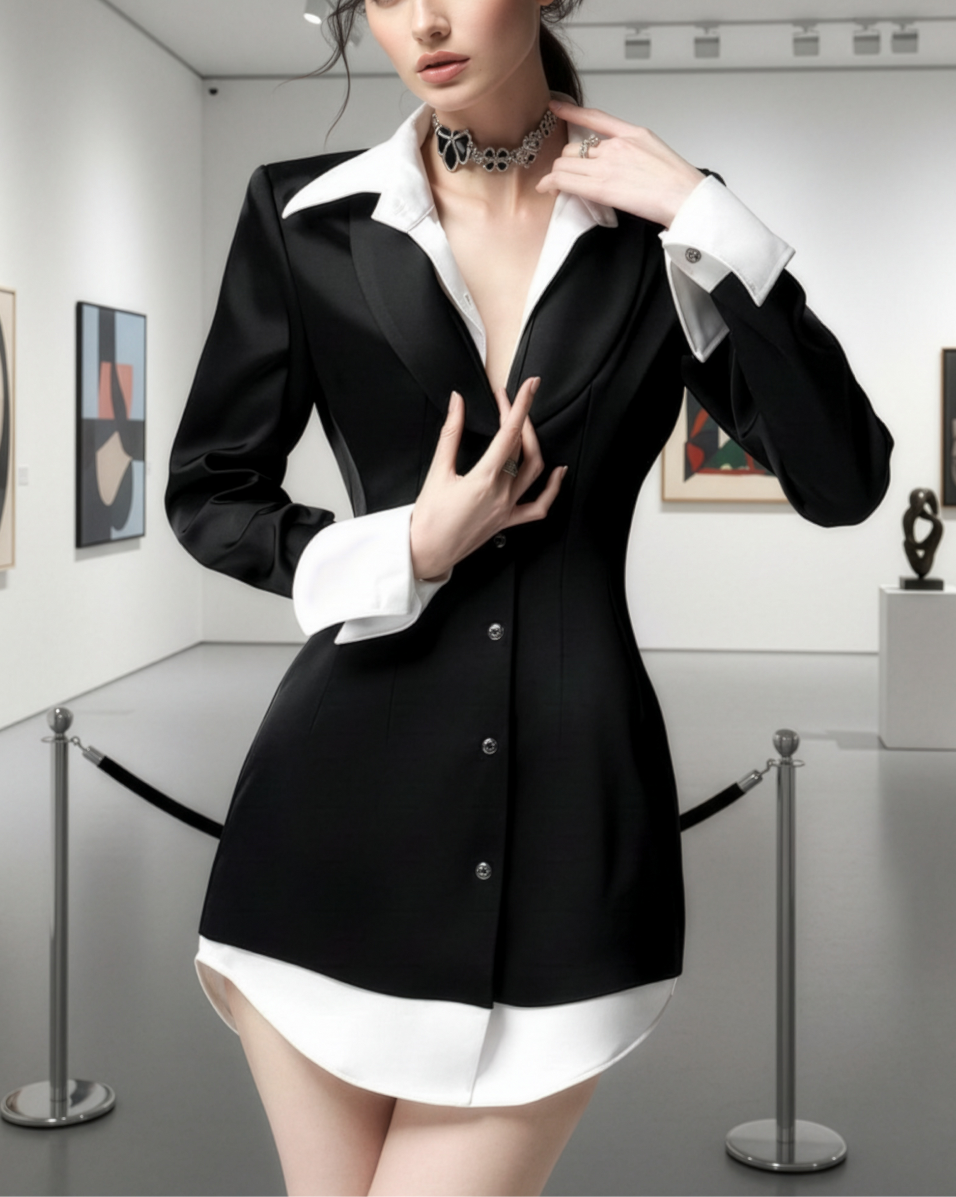 Experience the sophisticated look of the Blazer Shirt Dress. Crafted with a blazer dress silhouette and detailed with white accents, this garment also features a sharp shirt collar and shirt cuffs for a fitting finish. Strut in style with this timeless look, perfect for any special occasion.