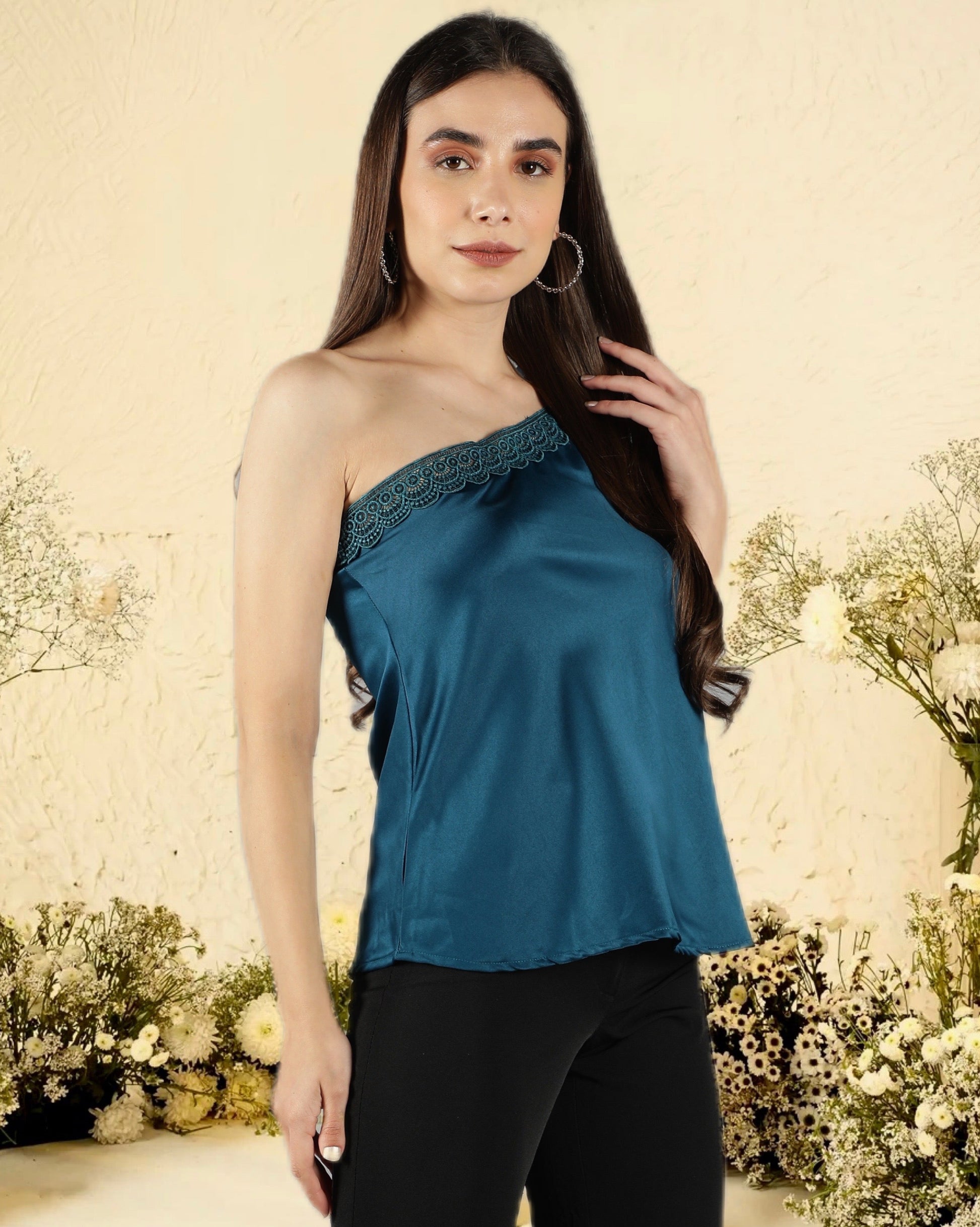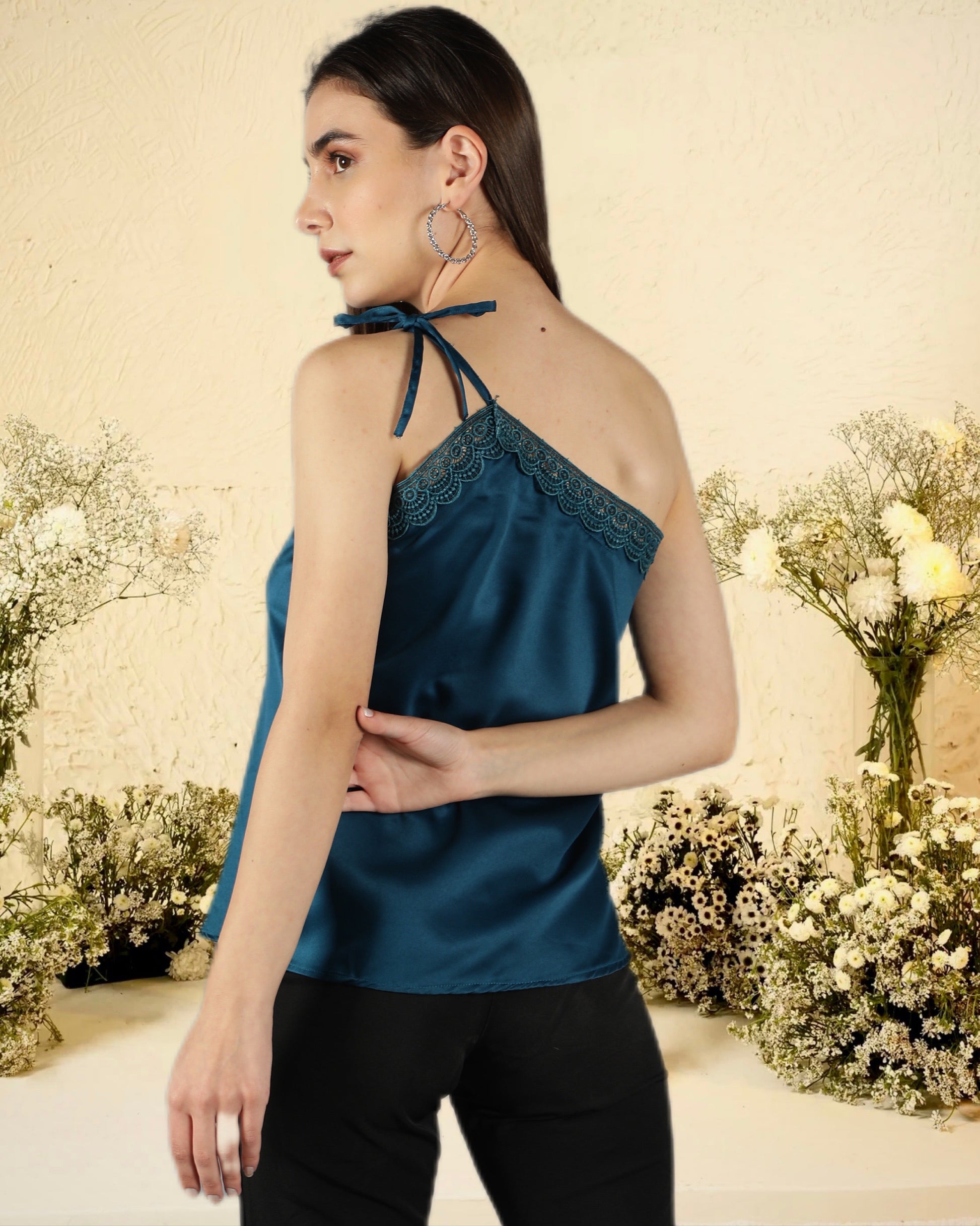 A gorgeous teal blue hue with satin's flattering drape emodies the Carly top.