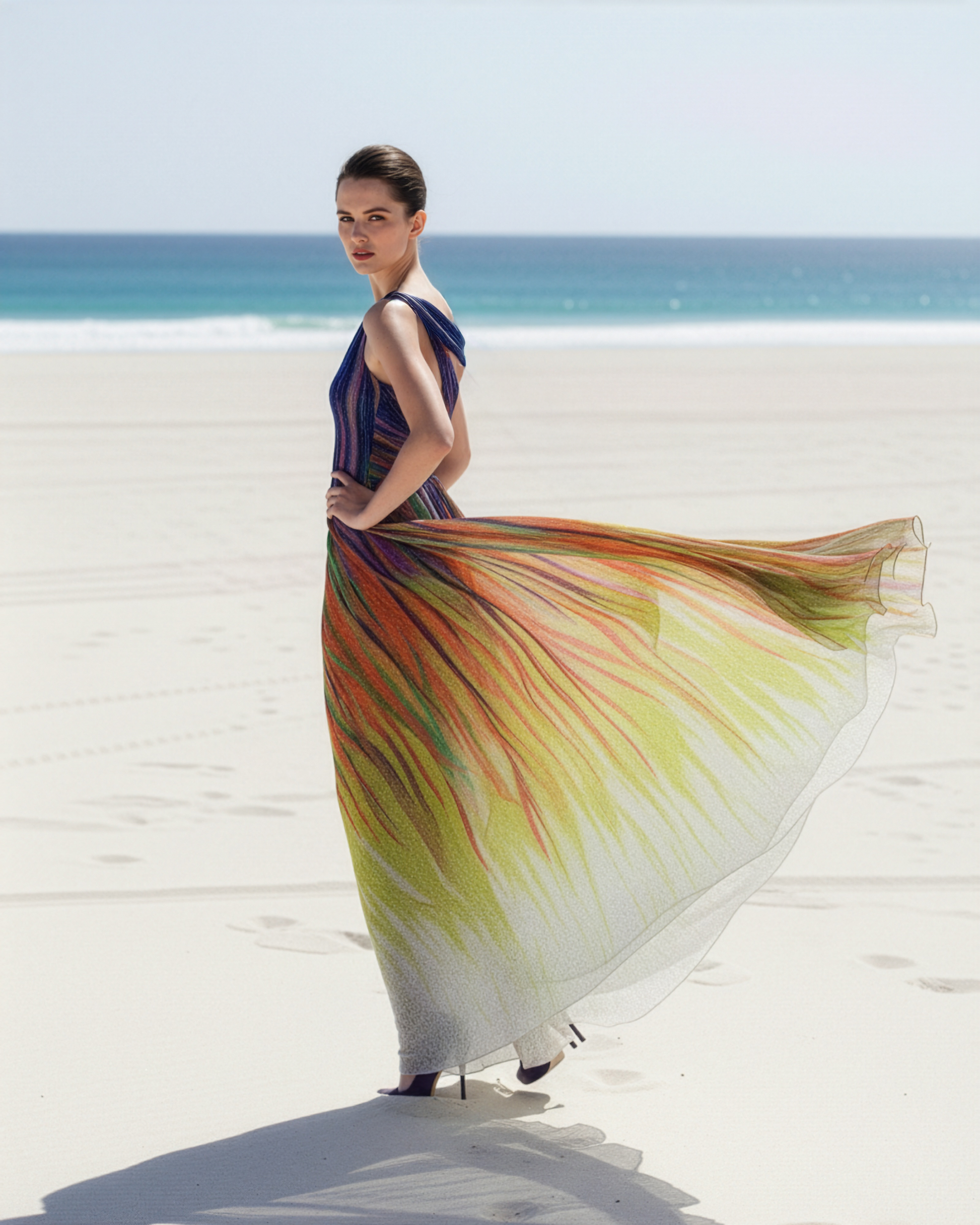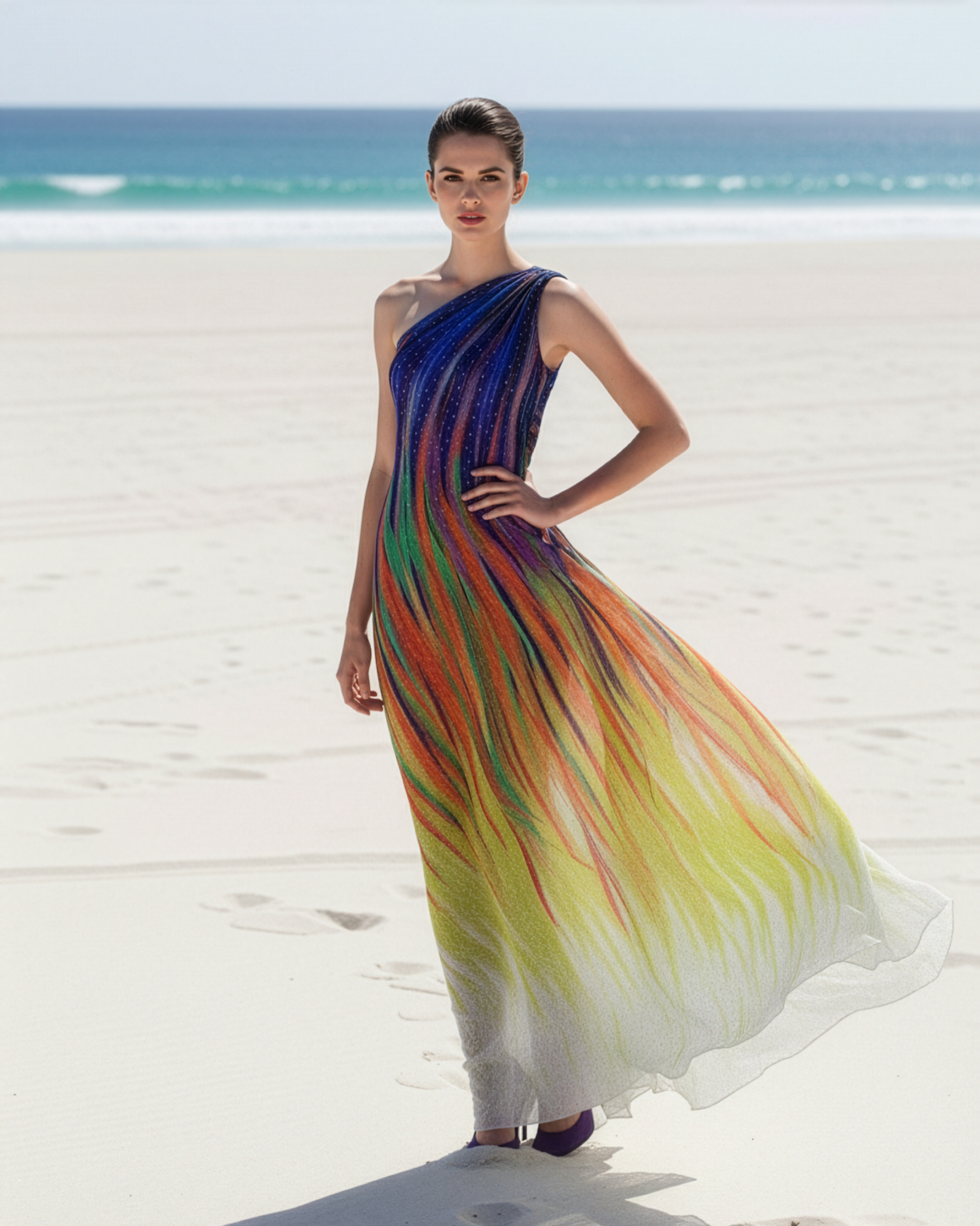 Embrace effortless elegance with this striking one-shoulder gown, adorned with a captivating multicolour print of delicate feather strokes. Perfect for resort getaways and upscale occasions, this sophisticated piece combines artistic flair with refined silhouette. The asymmetrical neckline creates a modern, flattering look while the flowing fabric ensures graceful movement. Ideal for those seeking a statement piece that balances bohemian charm with polished sophistication.