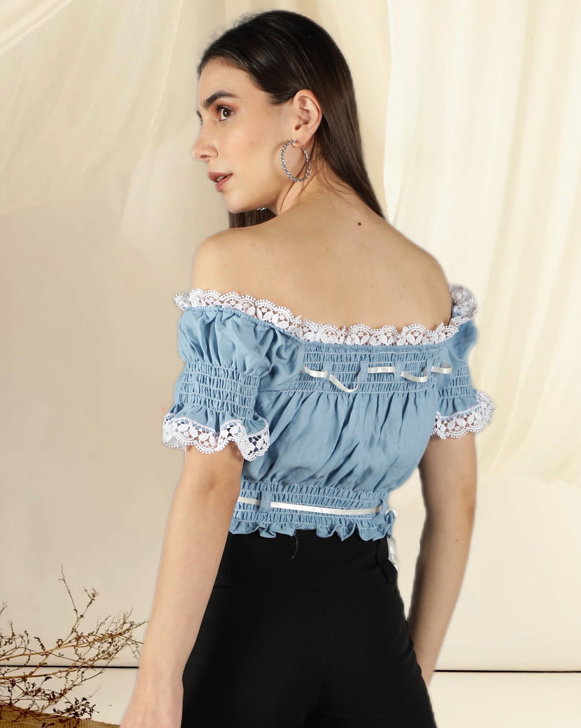 Emily top exudes ultra feminity with its crochet lace detailing, satin bow accents and smocked waist for the perfect silhouette.