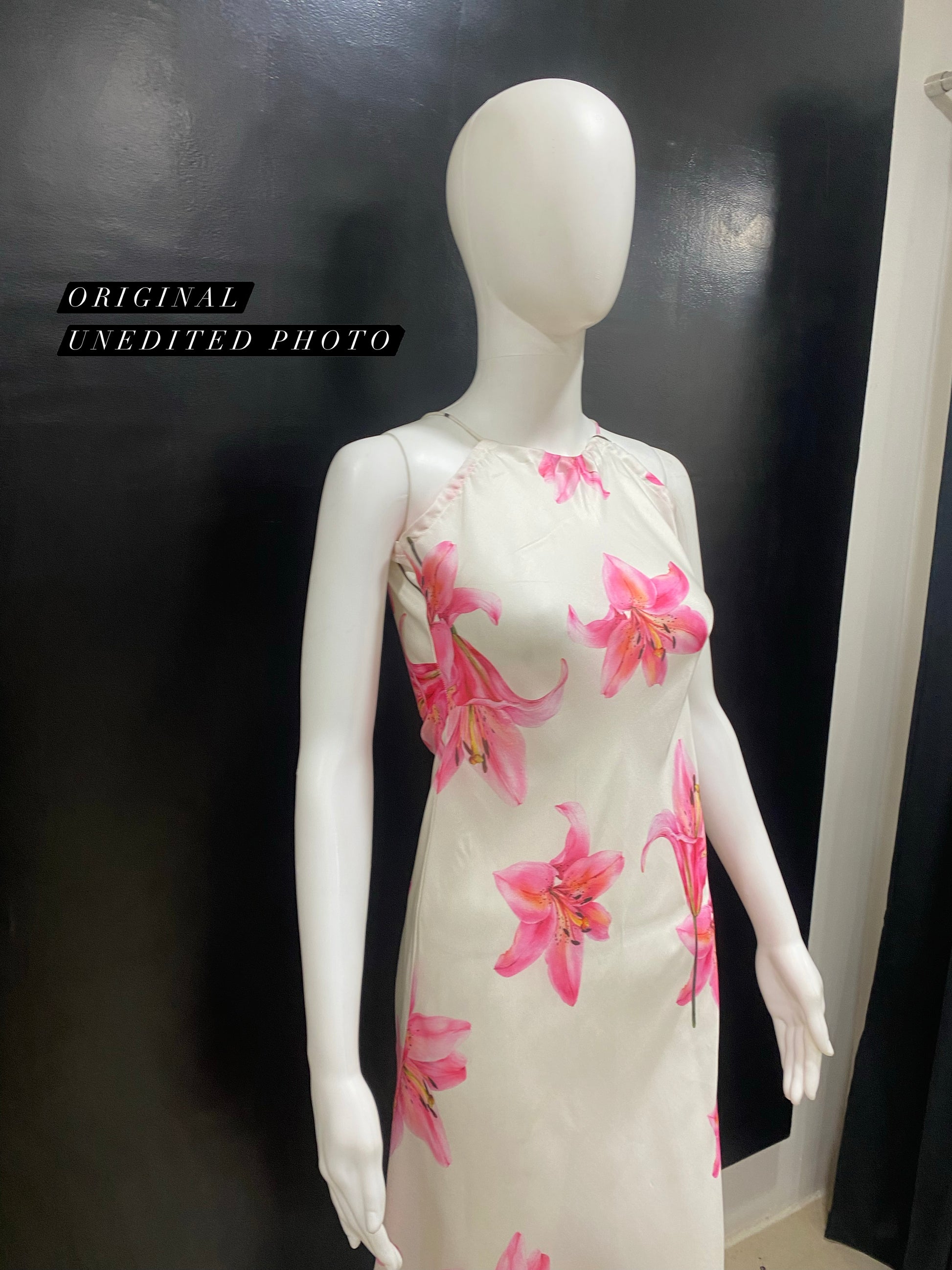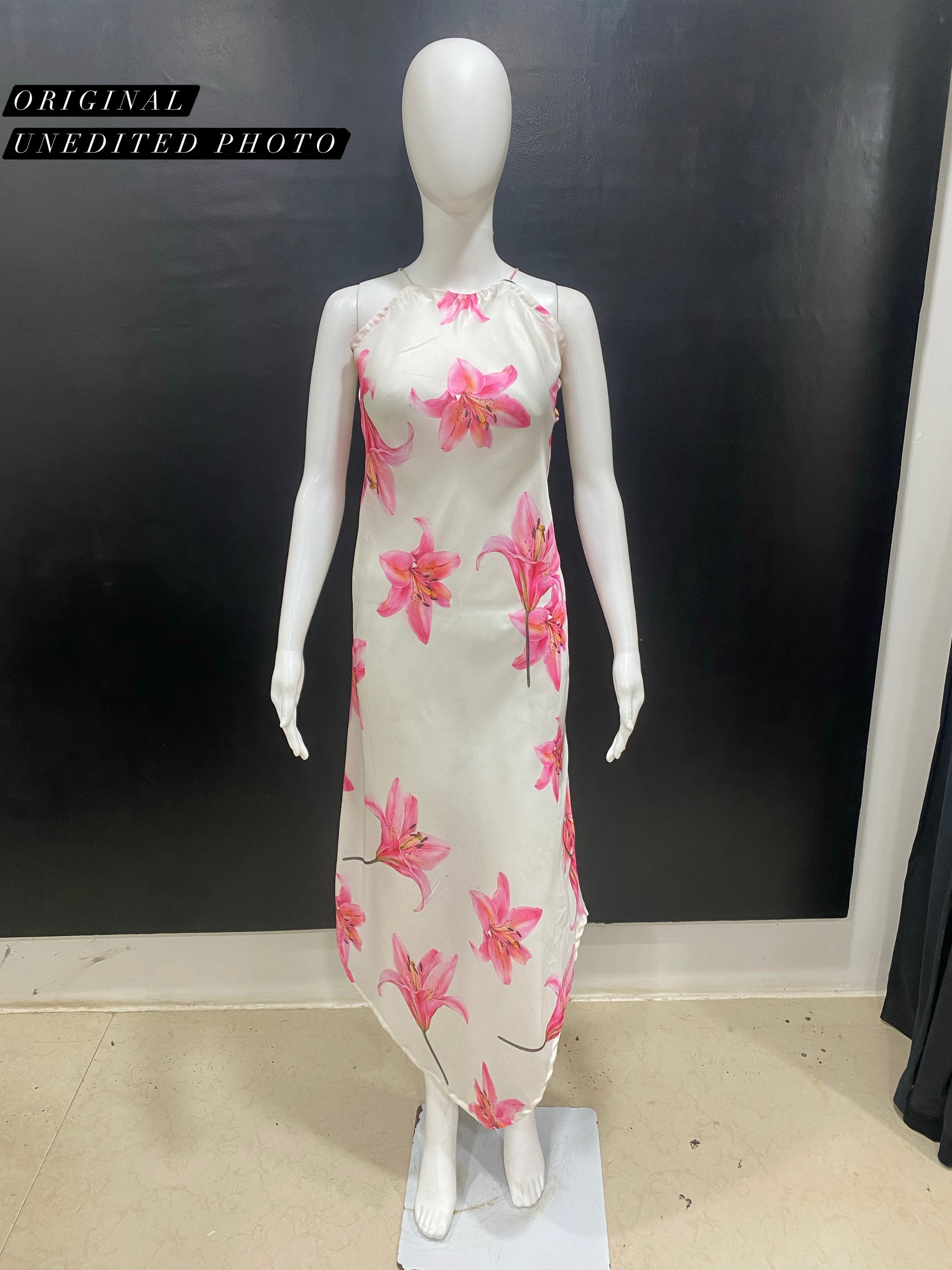 Crafted from high quality modal satin, the dress is adorned with an iconic Lily print, cut in a flattering halter neck style complete with a handkerchief hemline.