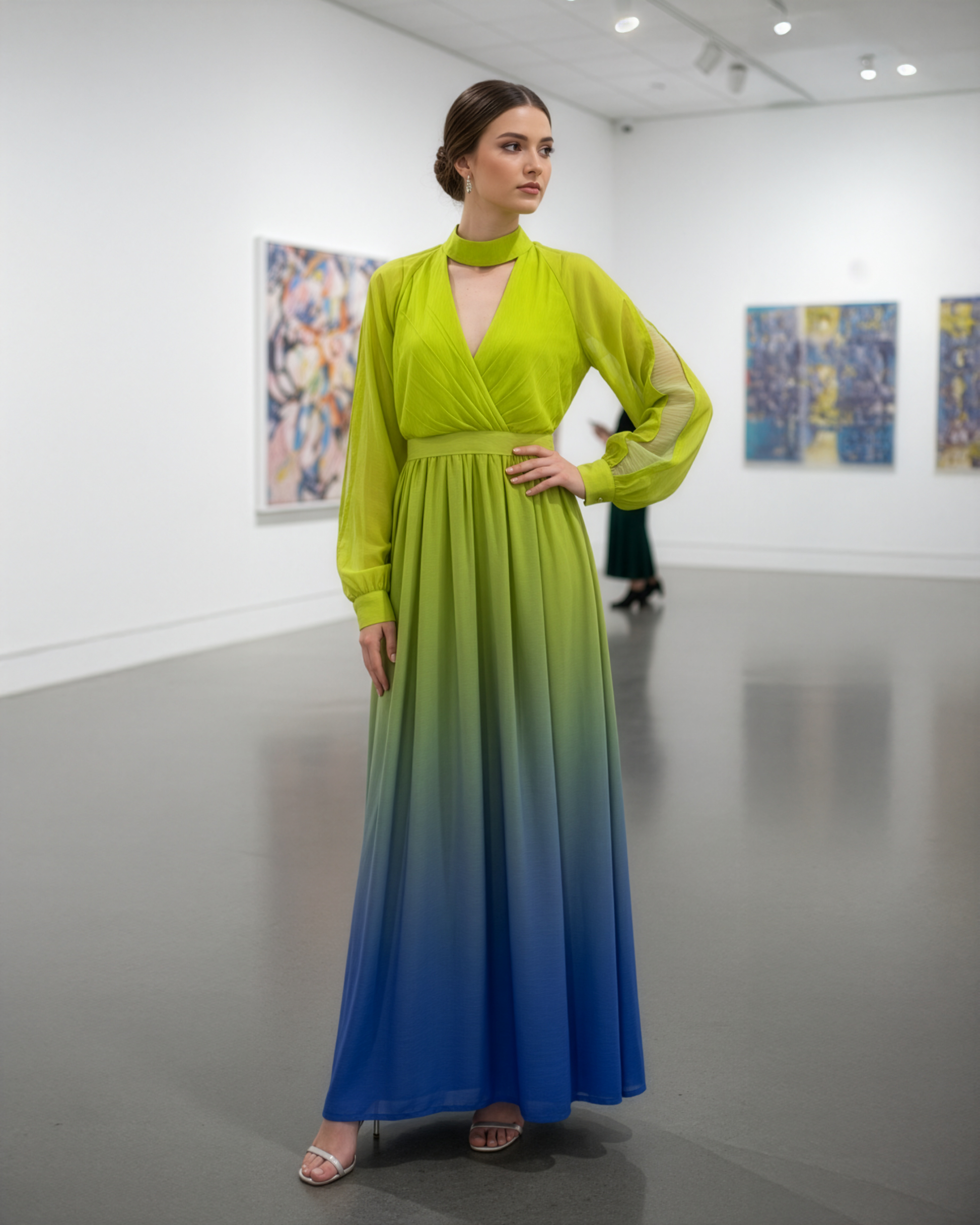Elevate your wardrobe with this sophisticated belted maxi dress, featuring a captivating ombre gradient that transitions from vibrant lime to soft lilac. The wrap front design creates a flattering silhouette while the striking cut-out sleeves add contemporary edge. Perfect for evening occasions or upscale daytime events, this piece combines refined elegance with modern design details.