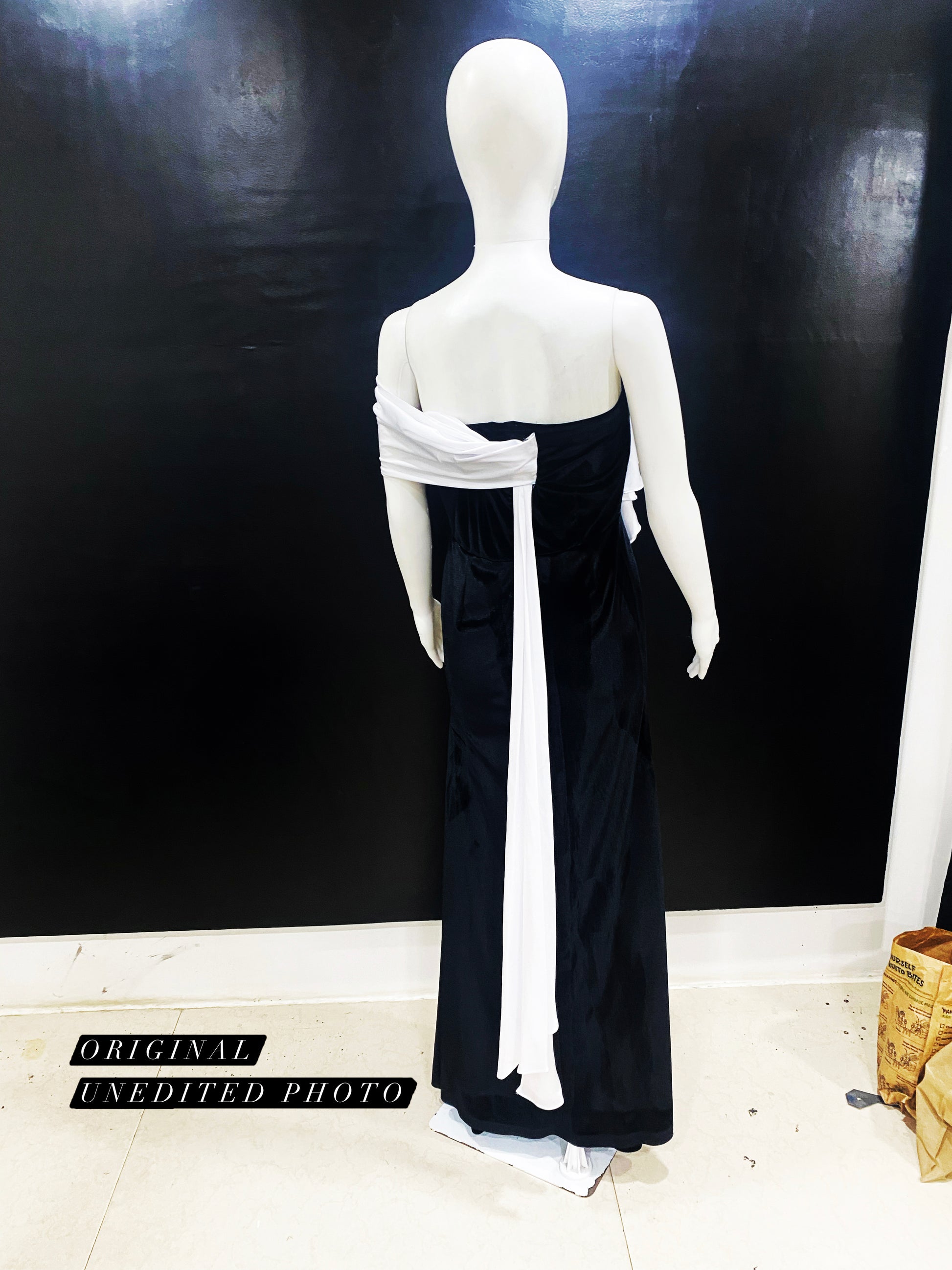 This elegant velvet gown features a sophisticated one-shoulder drape that contours the body with a flattering, form-fitting silhouette. The rich fabric gracefully complements a striking rose centrepiece, while a delicate frill front accent adds a touch of refined texture and movement. Perfect for making a memorable statement at any upscale event.