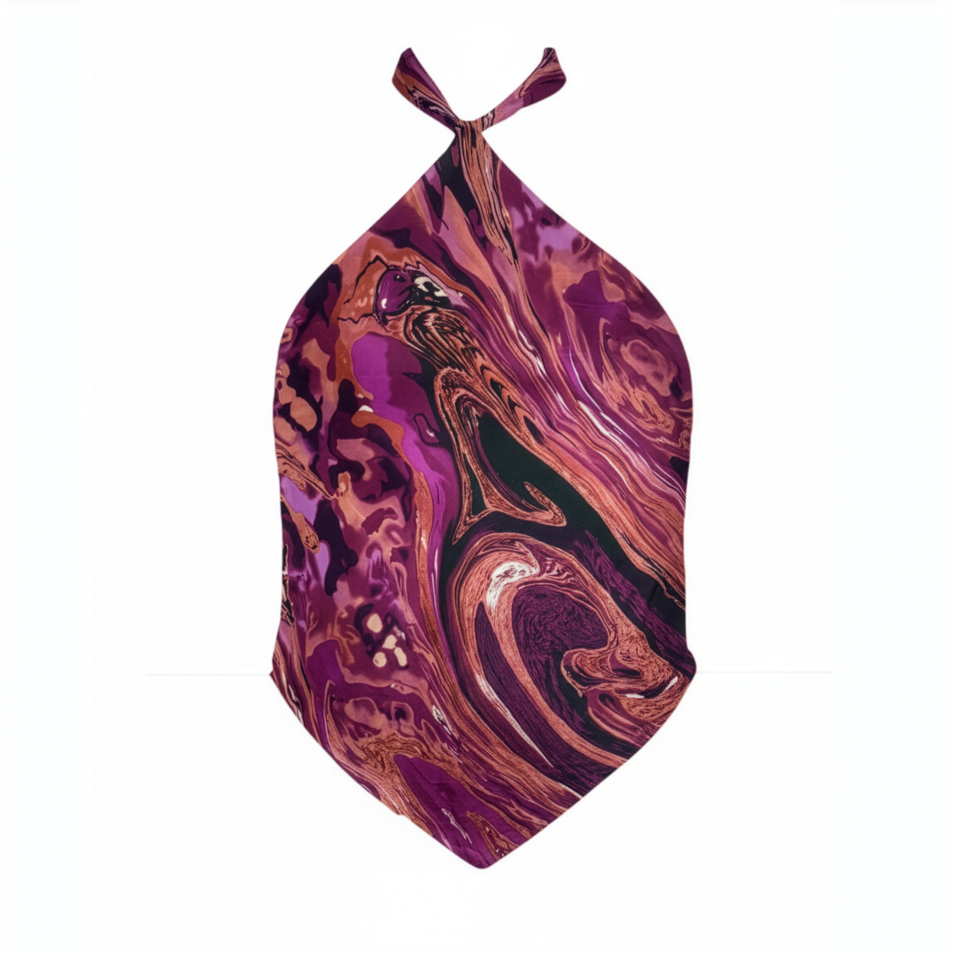 Elevate your wardrobe with this striking magenta marble print halter top. The handkerchief hem creates an effortlessly chic silhouette, perfect for layering or wearing solo. The vibrant marble pattern adds artistic flair to any outfit, while the halter neckline offers flattering support and a modern edge. Ideal for casual outings, brunches, or evening events where you want to make a statement.