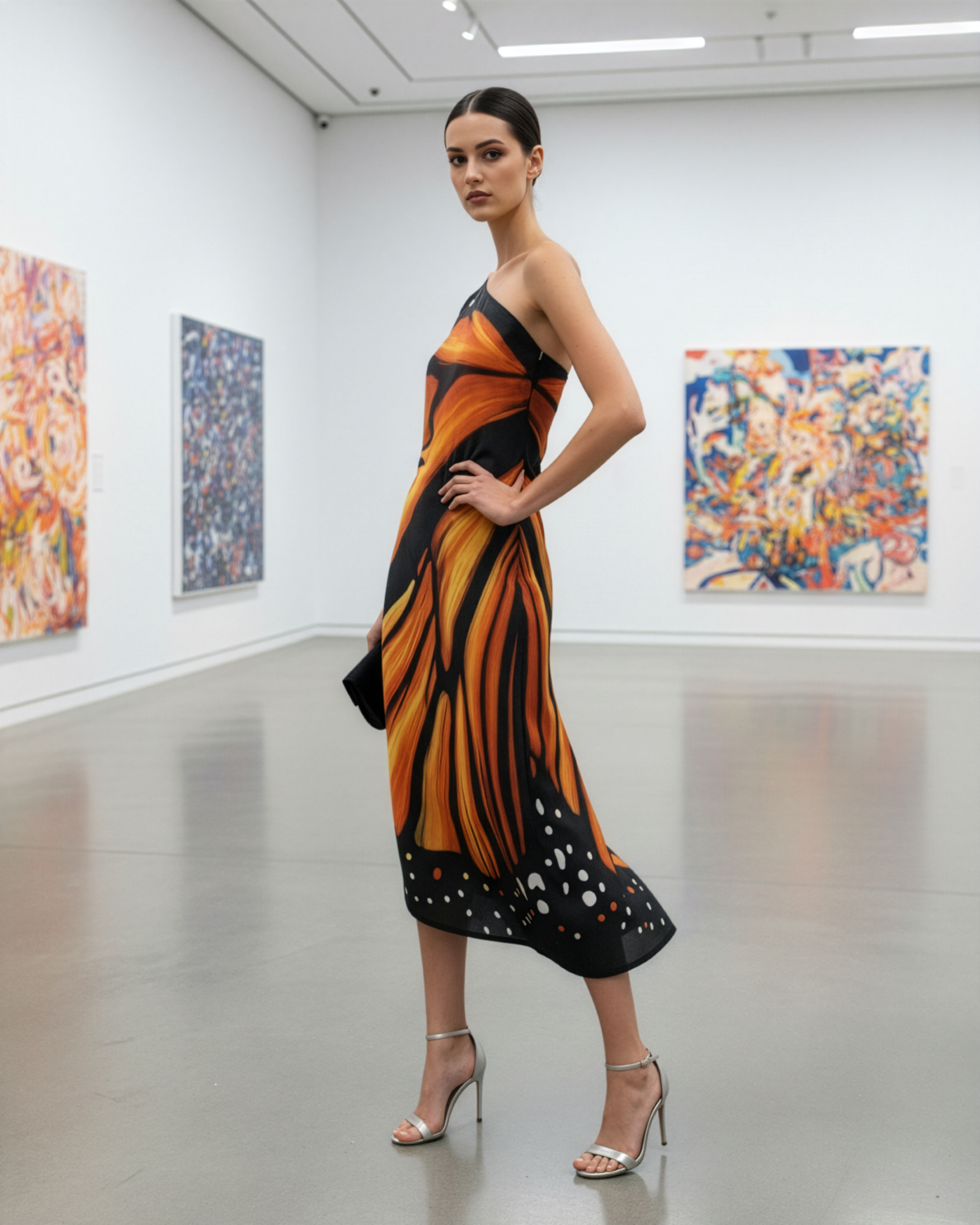 Introducing the Monarch ButterFly One Dress. With a custom monarch butterfly print, this one shoulder kaftan dress exudes a unique resort wear look. Embrace the elegance and artistry of this luxurious piece, perfect for any sophisticated and tasteful occasion.