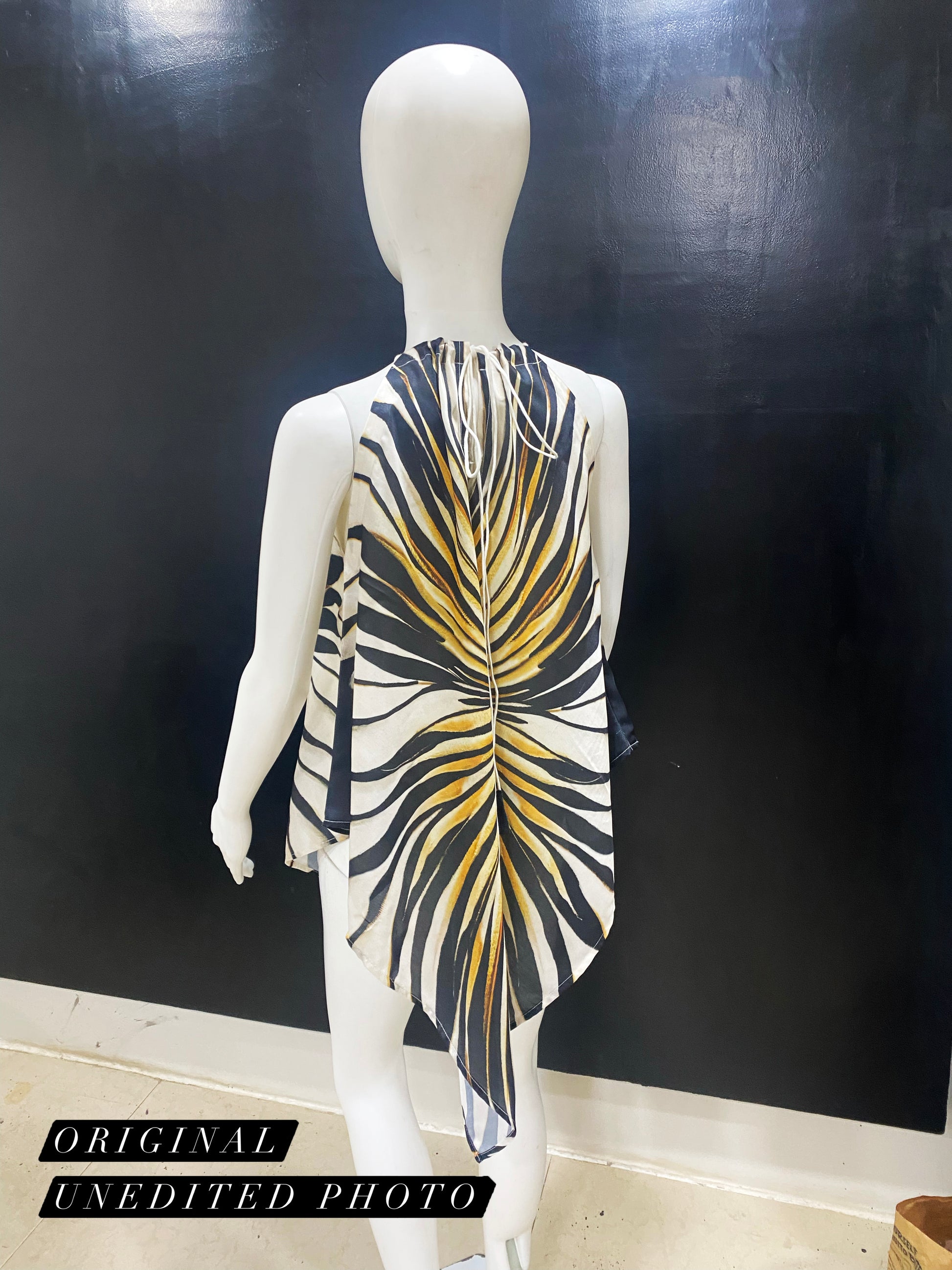 Indulge in luxury with our Monarch Tiger Handkerchief Top. The halter handkerchief design adds a touch of elegance to any outfit. The print is inspired by the monarch butterfly and the mighty tiger. Elevate your style with an exclusive piece that alludes to the world of art and fashion.