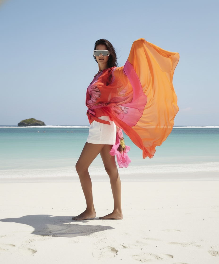 Effortless elegance meets tropical charm in this stunning hibiscus kaftan top. Featuring a vibrant pink to orange ombre backdrop, delicate floral prints bring nature's beauty to your wardrobe. The adjustable waist tie cinches for a flattering silhouette, while the relaxed cut offers comfort and breathability—perfect as a beach cover-up or casual layering piece. Ideal for warm weather styling.