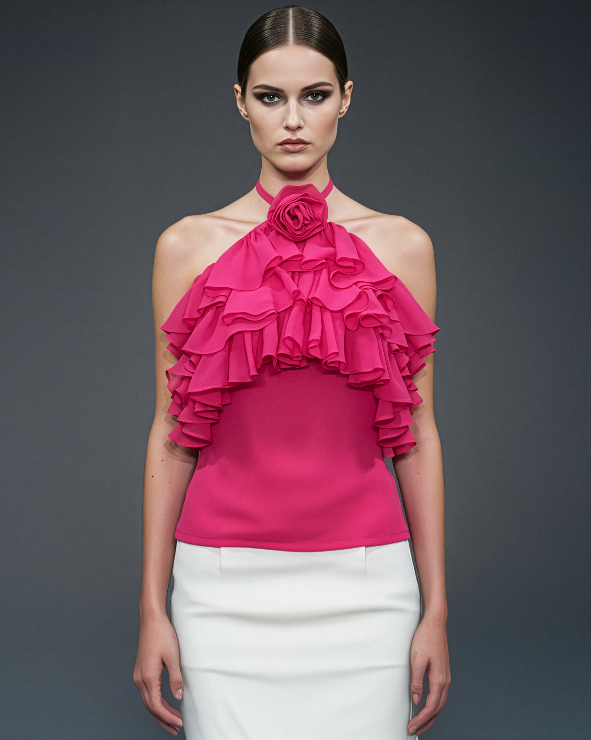 Indulge in luxury with our Pink Ruffle Halter Top. Featuring exaggerated ruffles and a delicate rose accent, this halter neck top exudes elegance and sophistication. Add a touch of romance to your wardrobe with this one-of-a-kind piece.