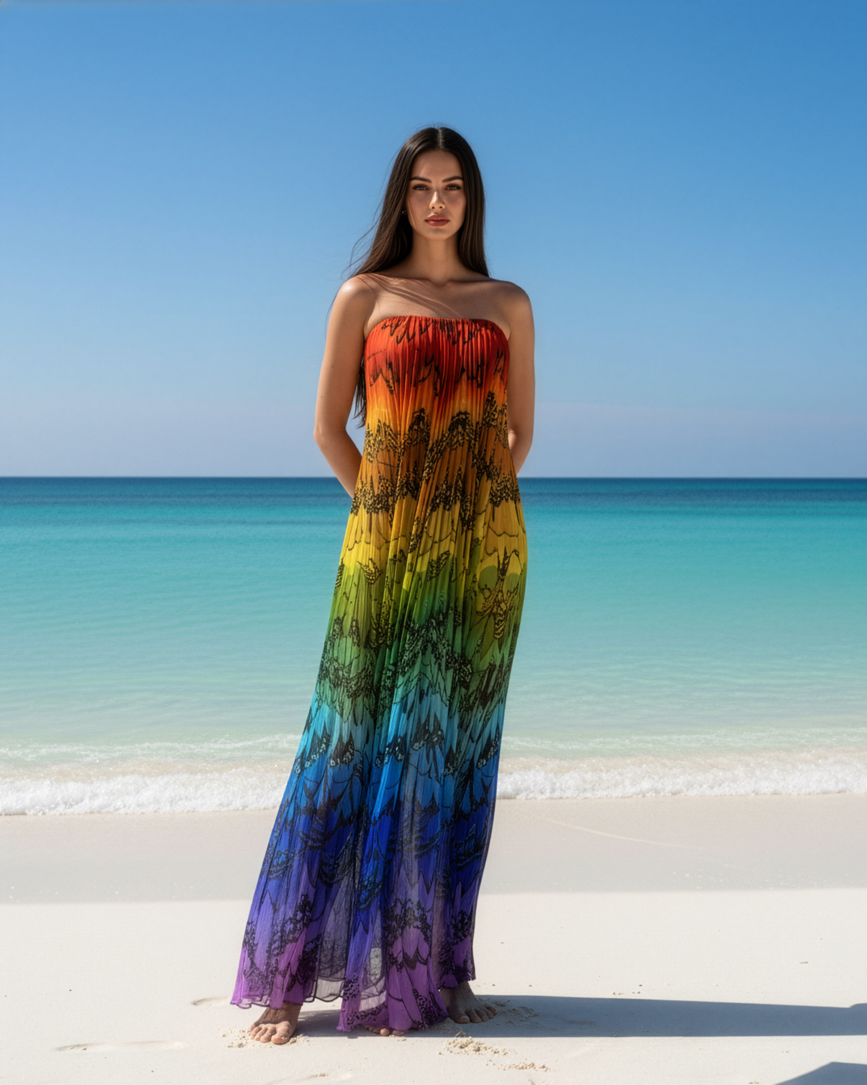 Indulge in luxurious resort wear fashion with our custom in-house designed Scarlet Macaw Tube Gown. Inspired by the vibrant colors and intricate patterns of the scarlet macaw bird's feathers, this pleated gown is a true work of art. Make a statement and stand out in this exclusive gown, perfect for any elegant occasion.