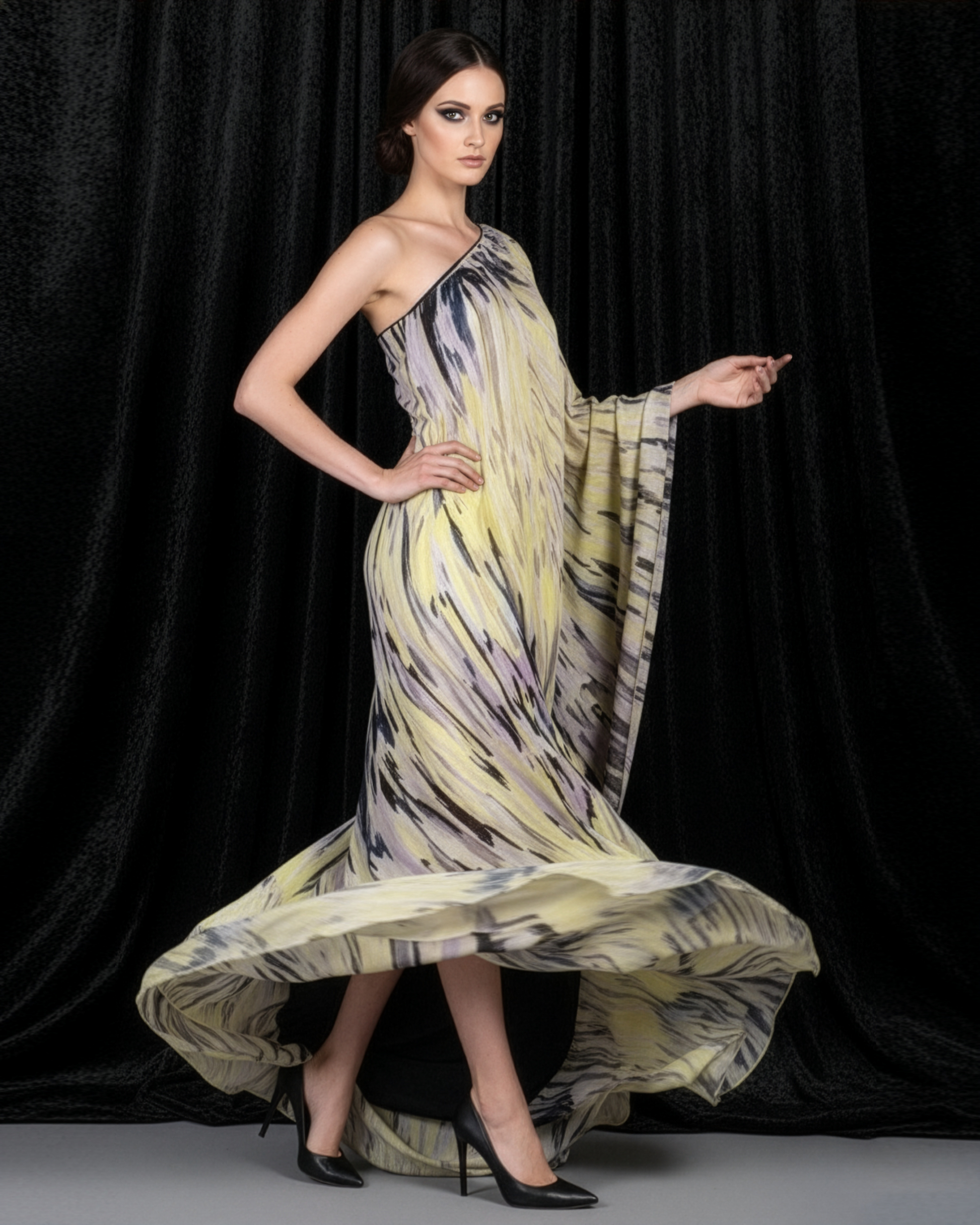 Embrace effortless elegance with this striking one-shoulder kaftan dress, where bold strokes of purple, yellow, and black dance across luxurious fabric. The flowing silhouette drapes gracefully, offering comfort and movement for any occasion—from casual gatherings to evening soirées. Perfect for those who appreciate artistic flair and relaxed sophistication in their wardrobe.
