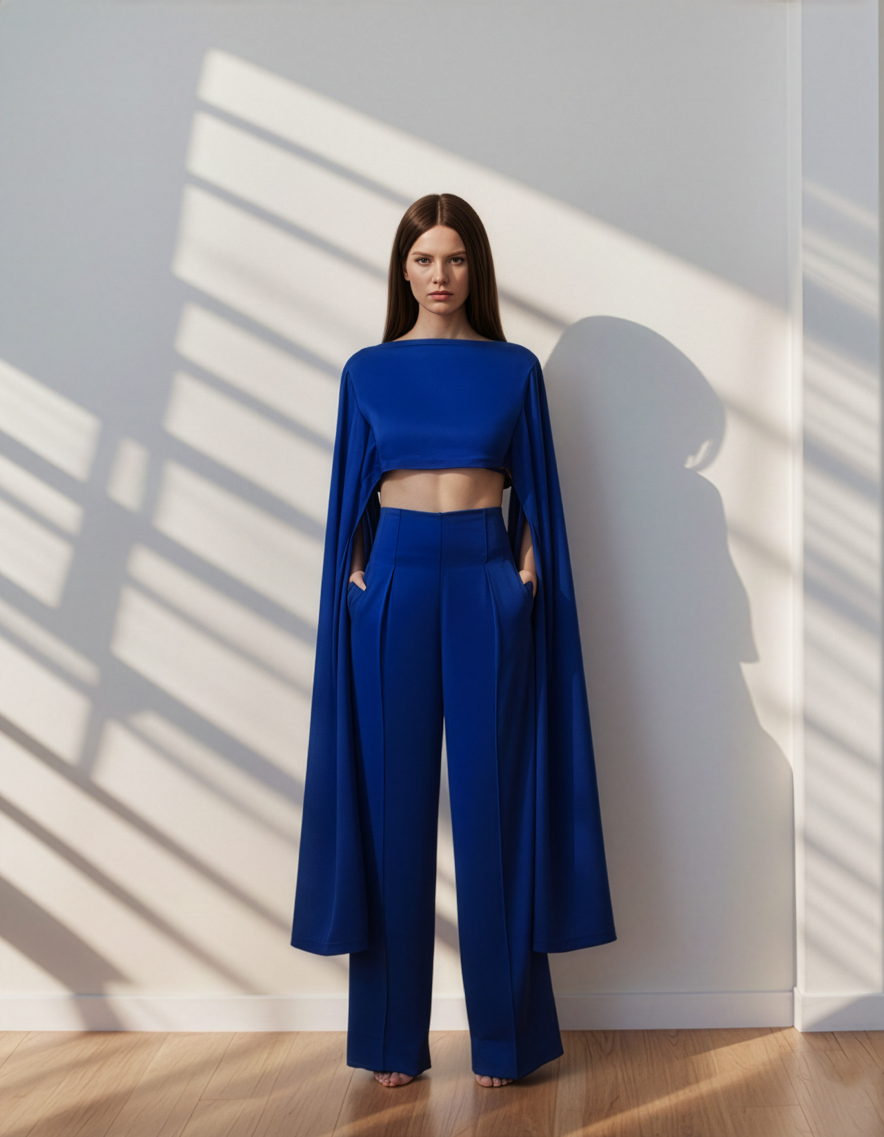 Elevate your wardrobe with this Electric Blue Co-Ord Set, featuring a crop top with dramatic flair sleeves that create a striking silhouette. The fitted trousers complimented by the body-flattering fabric, offering both style and comfort. Perfect for making a sophisticated statement at any occasion.