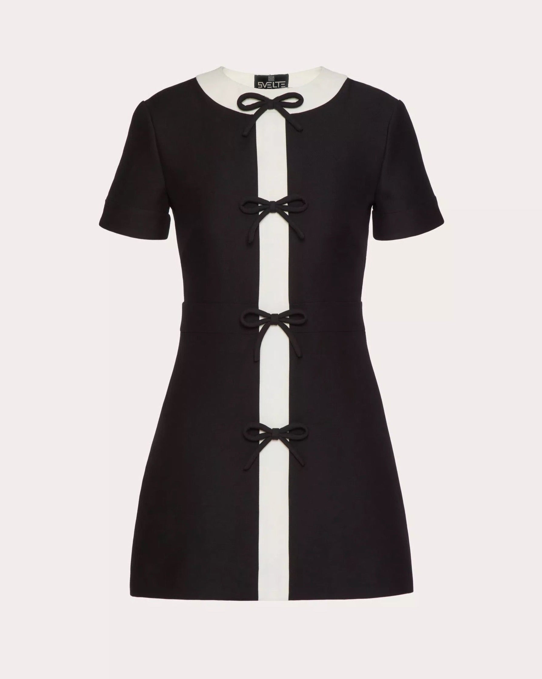 Show off your sophisticated style with the Val Bow Dress. This timeless black LBD is updated with bow accents for a flirty, fashion-forward twist. The skater silhouette is designed to flatter your figure in an effortlessly chic way. Feel confident and look stunning with a timeless classic.