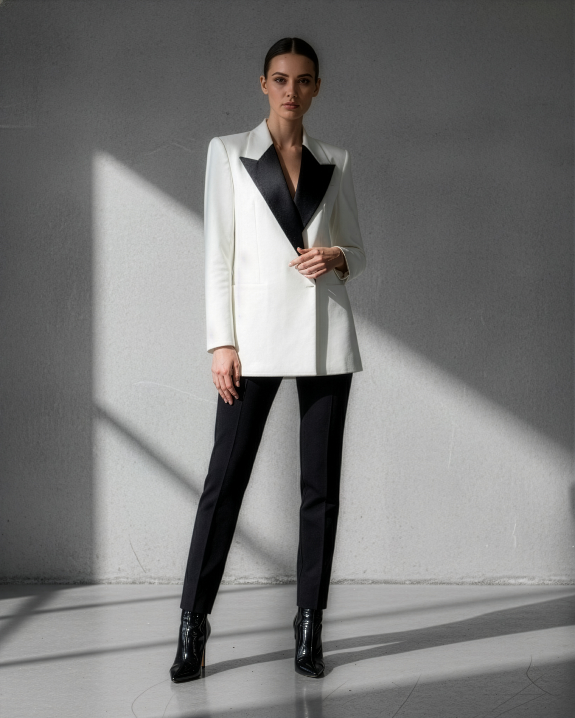 Introducing our White Black Accent Collar Blazer, a rich and elegant addition to your wardrobe. This classic blazer features a striking black accent collar, adding a touch of sophistication to any outfit. Elevate your style to a luxurious level with this must-have piece.