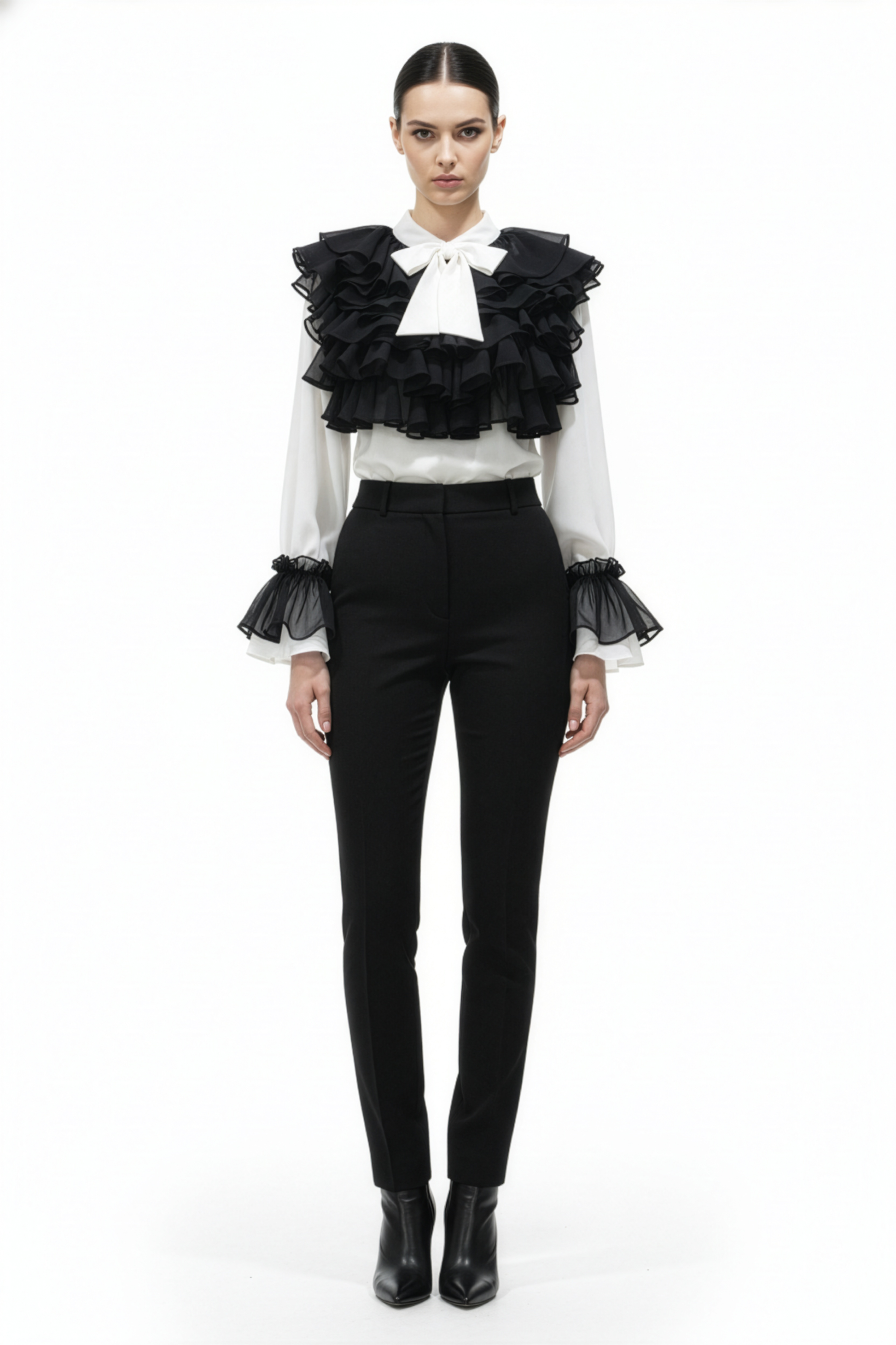 Indulge in the luxurious elegance of our White Black Ruffle Drama Top. Handcrafted from vintage inspired sheer fabric, this feminine top features delicate ruffles and hand accents for a touch of sophistication. Elevate your style with this exclusive piece.