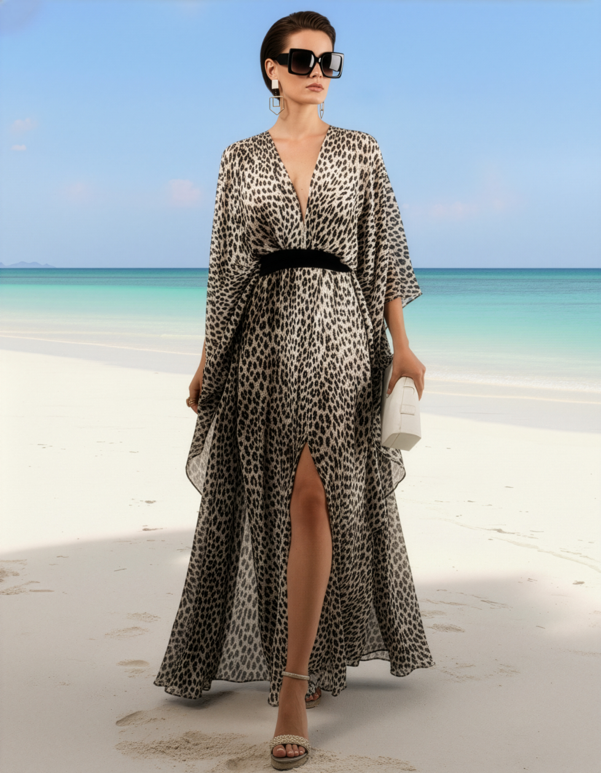 Effortless elegance meets tropical vibes with this White Cheetah Kaftan Cover Up. The striking cheetah print in crisp white tones brings a bold, fashion-forward edge to your beach wardrobe. Cut with a flattering V-neckline, this lightweight kaftan drapes beautifully over swimwear for an instantly polished resort look. Perfect for poolside lounging, beachside strolls, or evening transitions from sand to dinner. The relaxed silhouette offers comfort without compromising on style, making it an essential piece for your vacation essentials.