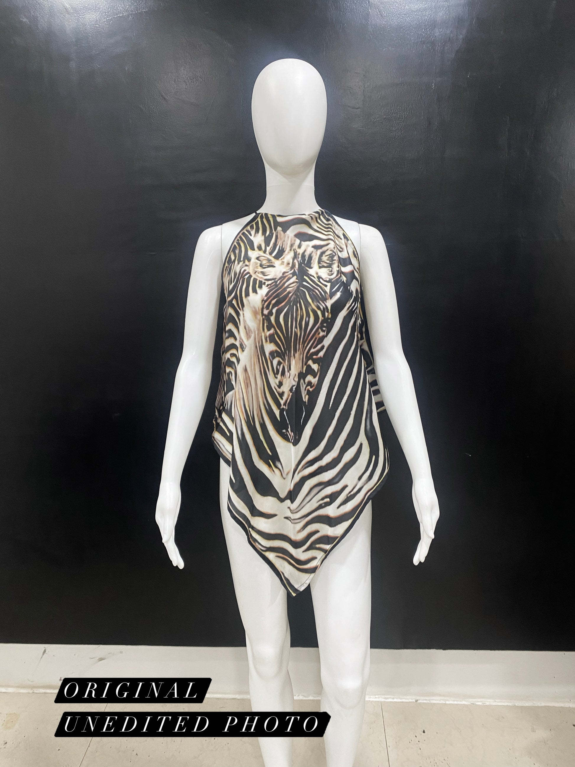 Indulge in luxury with our Zebra Handkerchief Top. The halter handkerchief design adds a touch of elegance to any outfit. Elevate your style with an exclusive piece that alludes to the world of art and fashion.